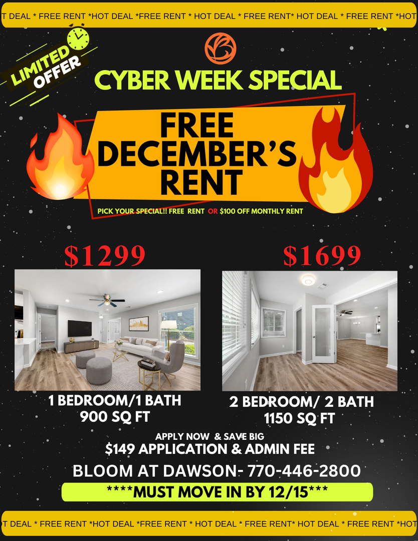 FREE RENT plus HUGE SAVINGS for 2026! BLOOM At Dawson has your NEW HOME for the NEW YEAR!